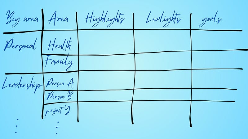 I start out reflecting on highlights and lowlights of my week in a few categories I choose to be the most important ones: