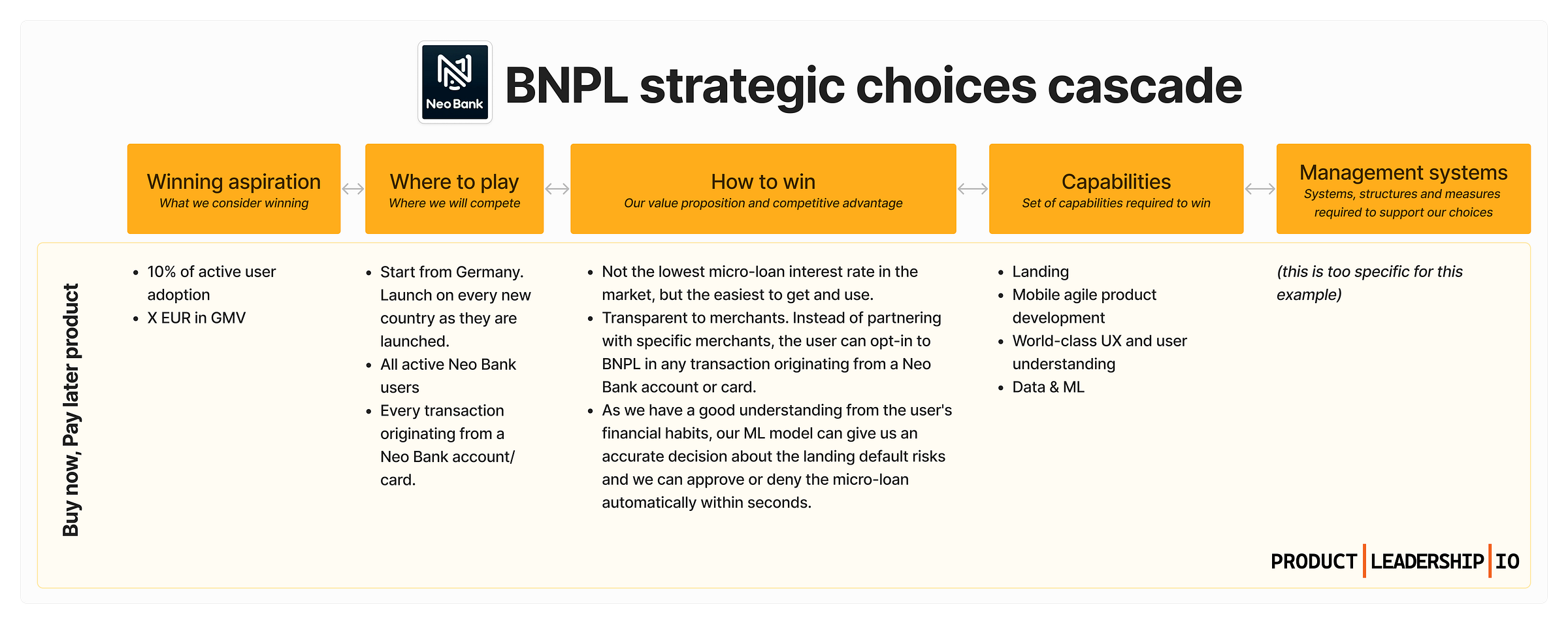 I will try to illustrate with an example of a fictional German neo-bank operating in Germany called Neo Bank (creative, I know). Imagine you are the PM responsible for introducing a new âbuy now, pay laterâ (BNPL) product. If Neo Bank was the typical company with a bad strategy, you would be given the goal of âreaching 10m BNPL transactionsâ or something like that and that was it. Do you feel empowered already? đ